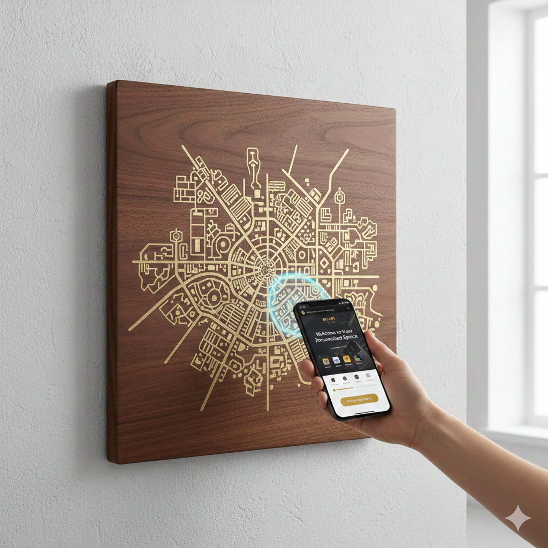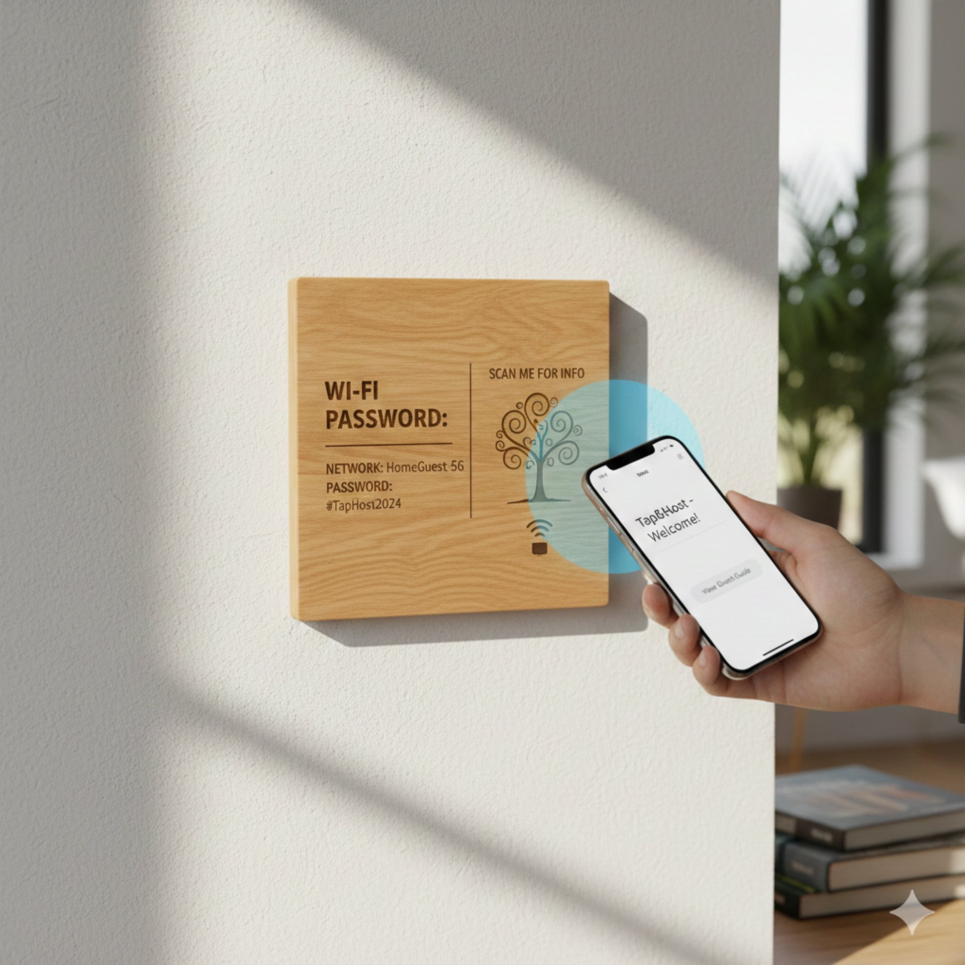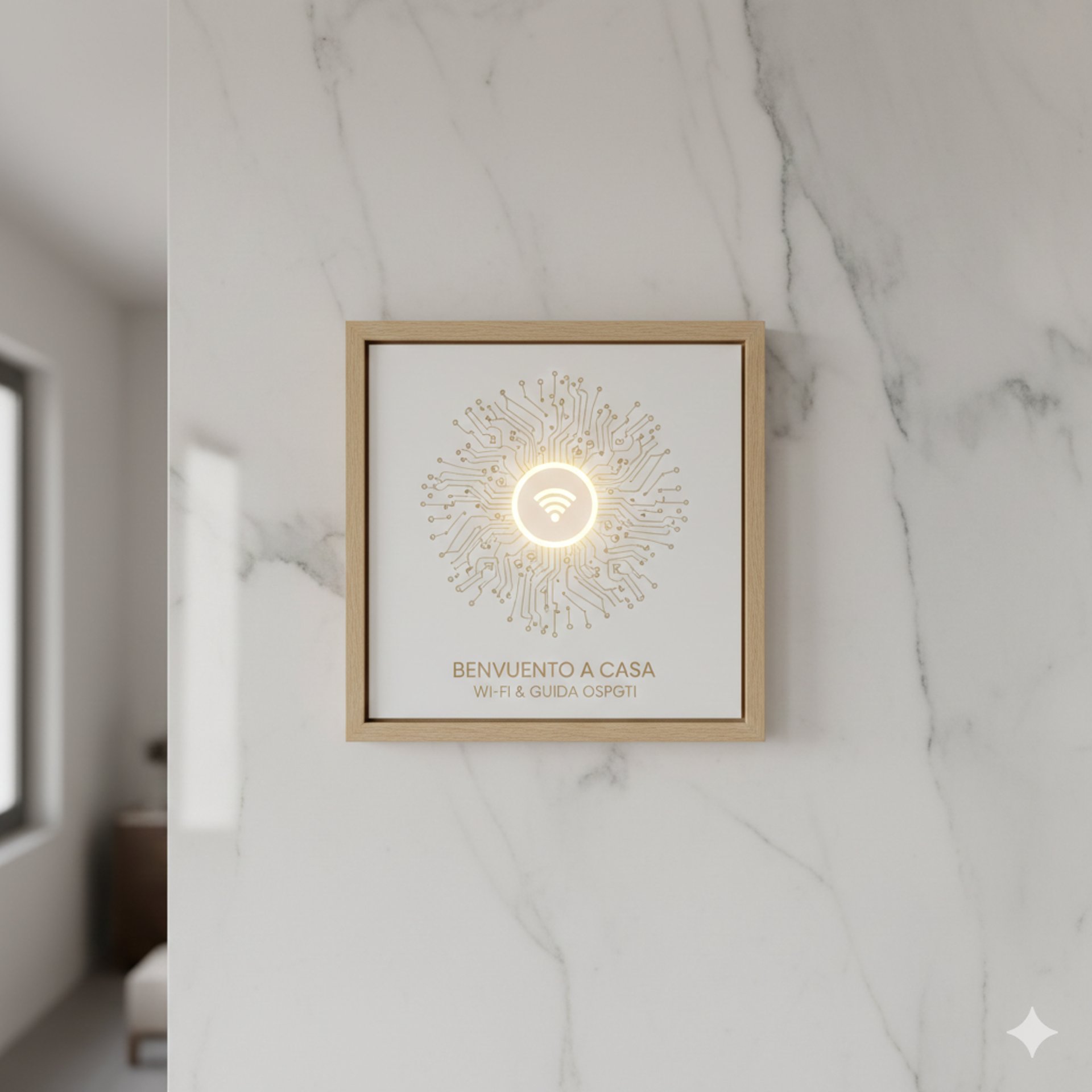 Decidi tu cosa mostrare. Possiamo eliminare le scritte standard per lasciare spazio solo al design, aggiungere icone social, istruzioni multilingue o messaggi di benvenuto personalizzati per i tuoi ospiti.